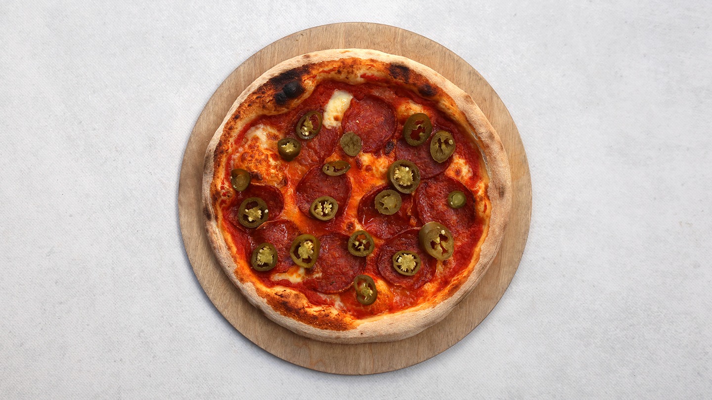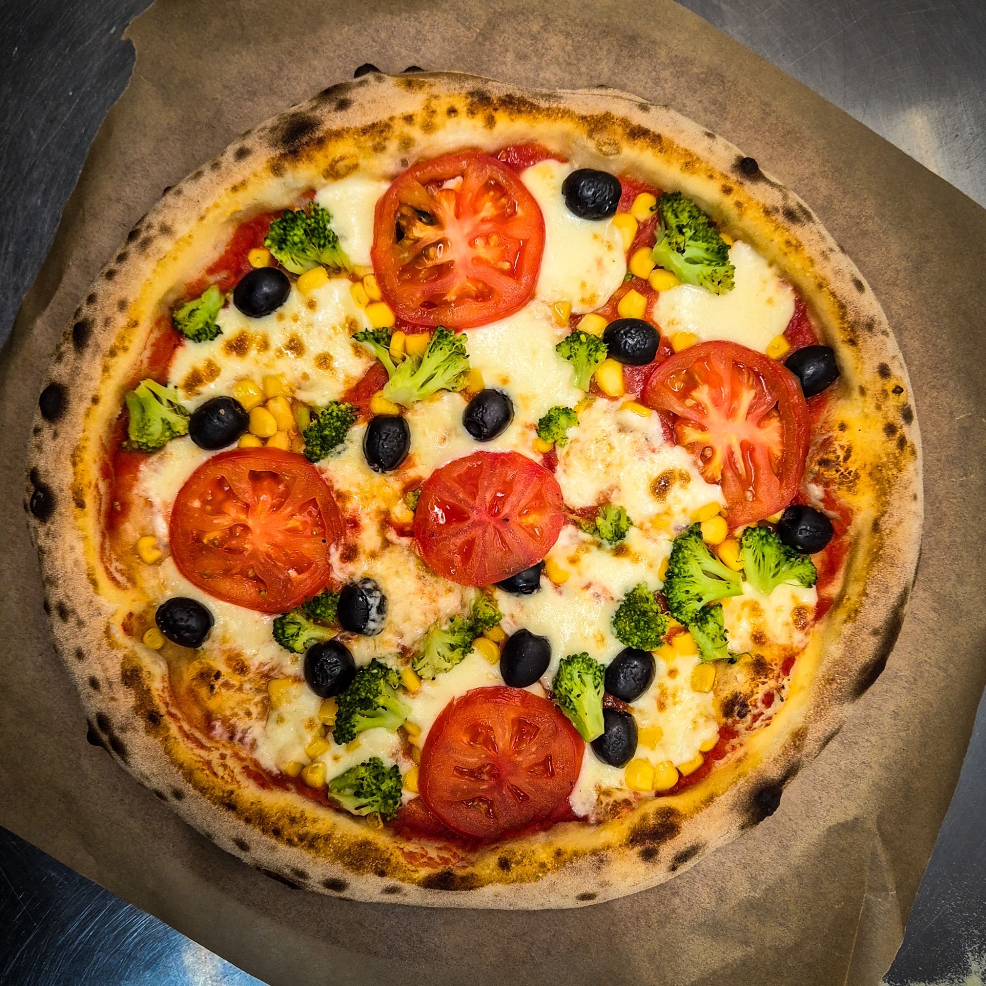 ostry sos pomidorowy, wegański ser mozzarella, salami wegańskie, kukurydza, czerwona fasola