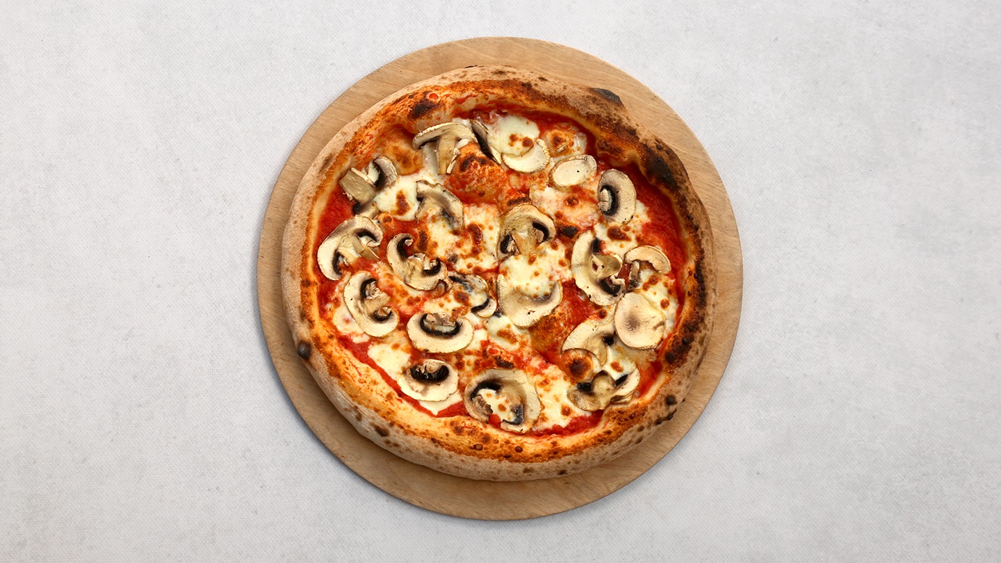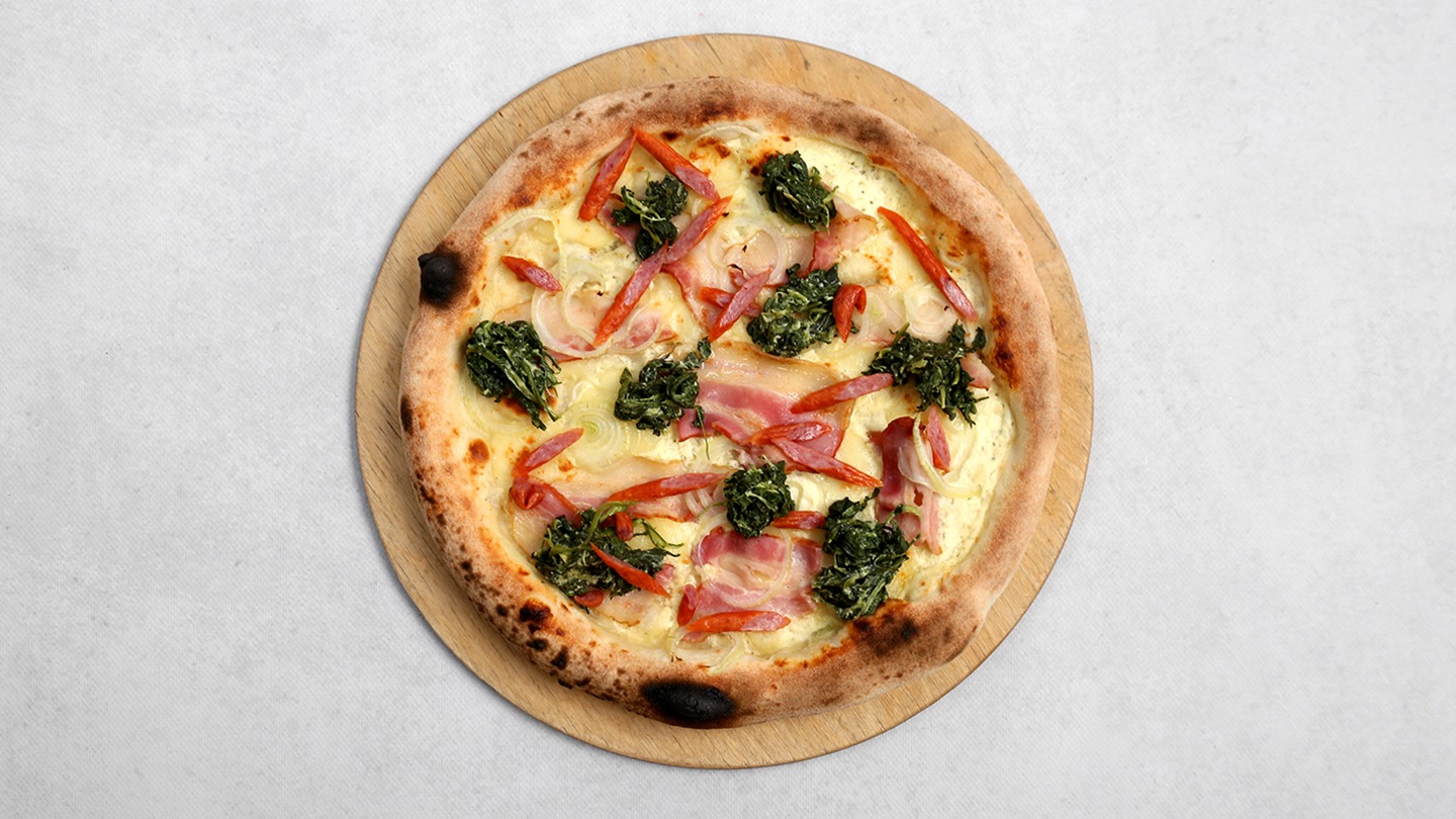 sos pomidorowy z pomidorów pelati, wegański ser mozzarella, grillowana cukinia, konfitura z czerwonej cebuli -